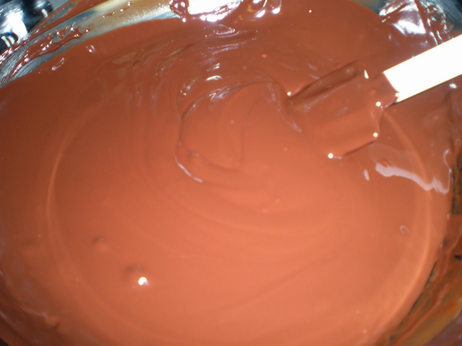 Melt all of the above and cool until tepid. Be careful in melting chocolate in the microwave--it works but you must do it slowly and at low power and stir often. Chocolate burns very quickly.
